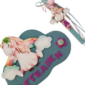 Συνοδεύεται από ασορτί Ταμπέλα δωματίου ή πόρτας” Μονόκερος σε ουράνιο τόξο” με το όνομα της μικρούλας . Η ταμπέλα είναι ένα συννεφάκι από χαρτόνι επενδυμένο με ύφασμα φετρίνα σε old green χρώμα το οποίο στολίζει ξύλινο στοιχείο ” Μονόκερος σε ουράνιο τόξο” , το όνομα του παιδιού ,και δύο λουλουδάκια από φοαμ με γκλίτερ. Έχει διάσταση 29 χ 20 εκ., και στην πίσω πλευρά διαθέτει αυτοκόλλητες ταινίες για να το κρεμάσετε στην πόρτα του δωματίου χωρίς να χρειαστεί να τρυπήσετε και κορδόνι αν προτιμάτε να το κρεμάσετε στον τοίχο.