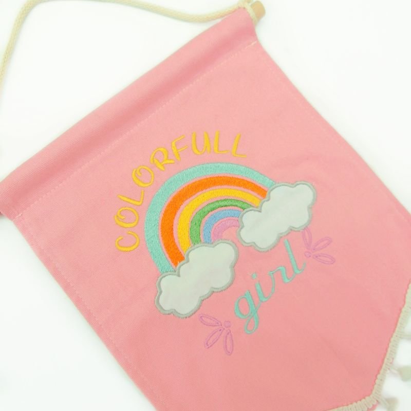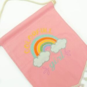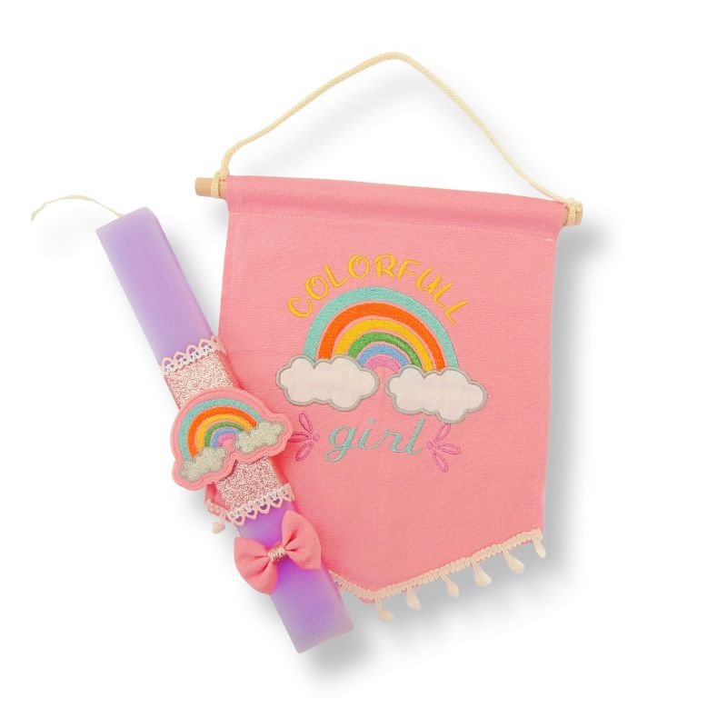 Η τέλεια πρόταση για το βαφτιστήρι σας! Ένα σετ που συνοδεύετε από ροζ υφασμάτινο μπάνερ με κεντημένο σχέδιο ουράνιο τόξο colorfull girl!
