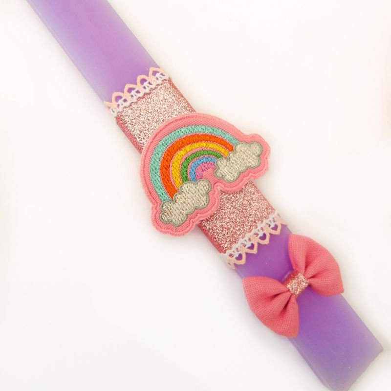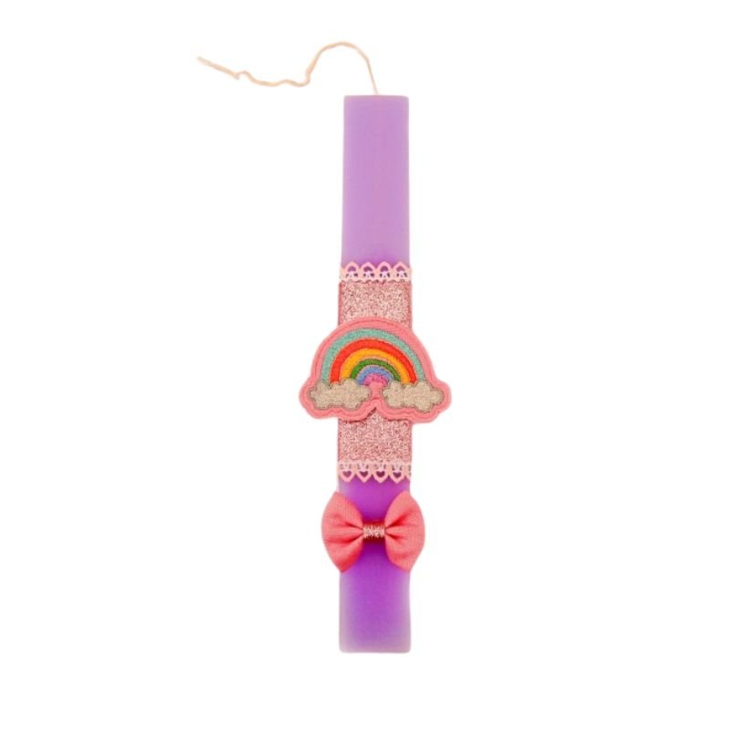 Χειροποίητη αρωματική πλακέ λαμπάδα ουράνιο τόξο σετ με μπάνερ για κορίτσι.
