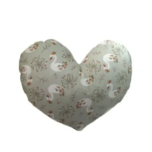 Συνοδεύεται από διακοσμητικό μαξιλάρι σε σχήμα καρδιά από 100 % βαμβακερό ύφασμα ελεγμένο και πιστοποιημένο για βλαβερές ουσίες σύμφωνα με το Oeko-Tex Standard 100/1, σε βεραμάν χρώμα με κύκνους, . Έχει υποαλλεργική γέμιση, δεν διαθέτει φερμουάρ και η διάσταση του είναι 36 χ 30 cm.