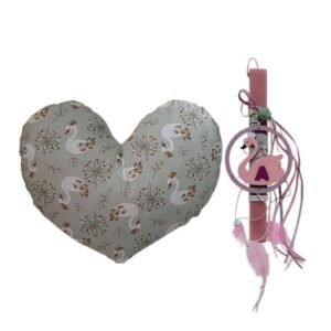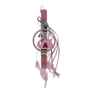 Λαμπάδα πλακέ ροζ (28 χ3 εκ. ) με ξύλινο κρεμαστό διακοσμητικό στεφάνι με κύκνο και το μονόγραμμα της μικρούλας σας, που μπορεί να διακοσμήσει το παιδικό δωμάτιο.