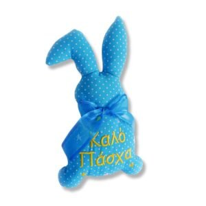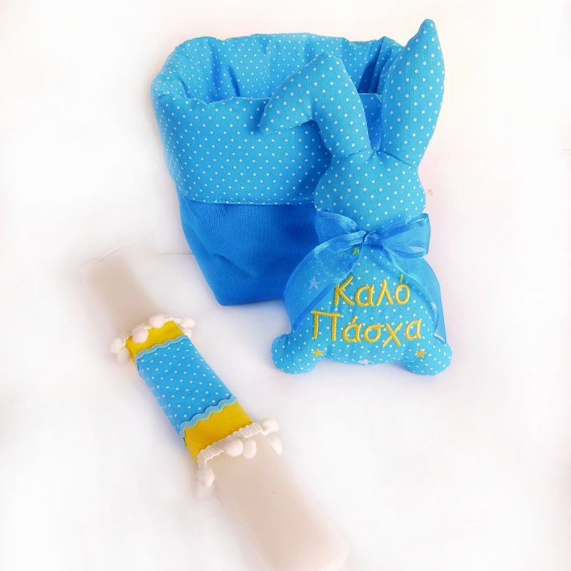 Η λαμπάδα έχει χρώμα λευκό και ο λαγός είναι υφασμάτινος με κεντημένο μπροστά “καλό Πάσχα” και έχει σετ υφασμάτινο καλάθι στους ίδιους χρωματισμούς.