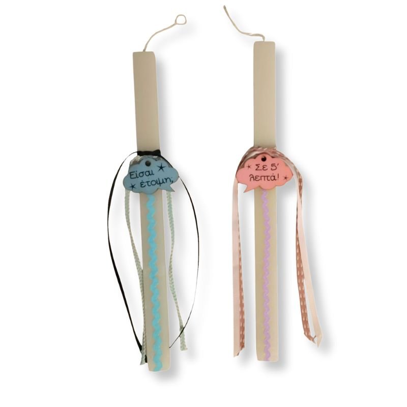 Ένα σετ λαμπάδων σε λευκό χρώμα με απαλό άρωμα, 28 εκ με χιουμοριστικό μήνυμα “είσαι έτοιμη ?” “σε 5 λεπτά ” για να δώσει μια άλλη πνοή αυτό το Πάσχα!