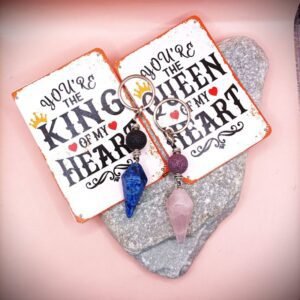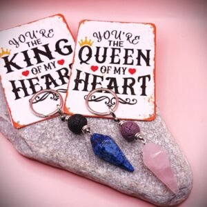 Μπρελόκ με κρεμαστούς λίθους σε εκκρεμές Ροζ Χαλαζία και Λάπις Λαζουλις. Ατσάλινος κρίκος για κλειδιά και μεταλλικά στοιχεία σε ασημί χρώμα. Ροζ χαλαζίας πυραμίδα για τη γυναίκα με επιπλέον λιθο Λάβας και Λάπις Λαζουλις για τον άνδρα με επιπλέον μαύρο λίθ Λάβας. Ιδανικό δωράκι για ζευγάρια με ενεργειακές ιδιότητες. Στη συσκευασία περιέχεται καρτελάκι με τις ιδιότητες των λίθων.