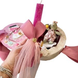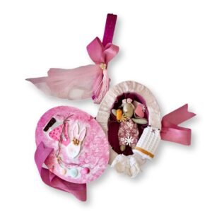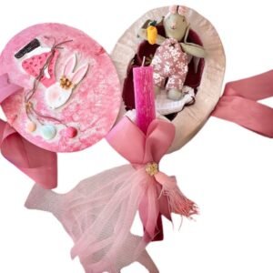 Χειροποίητο πασχαλινό σετ με ένα μοναδικό κουτί σε σχήμα αυγού, που κρύβει μέσα του μια υπέροχη μινιατούρα κουνελίτσας με δύο εναλλακτικές φορεσιές και αξεσουάρ. Το κουτί είναι κατασκευασμένο από ξύλο και χαρτόνι, επενδυμένο με γυψόγαζα, πηλό, υφάσματα, κορδέλες και διακοσμητικά στοιχεία από γύψο, ενώ η λαμπάδα που το συνοδεύει είναι στολισμένη με υλικά που ταιριάζουν απόλυτα στο σύνολο. Ένα ξεχωριστό δώρο για το Πάσχα, ιδανικό για νονούς, μαμάδες και γιαγιάδες που εκτιμούν τις μοναδικές, χειροποίητες δημιουργίες.