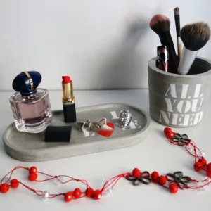 Σετ που αποτελείται από ένα οβάλ δισκάκι και ένα πολυχρηστικό βάζο, φτιαγμένα από γκρι τσιμέντο. Είναι ζωγραφισμένα στο χέρι και περασμένα με ακρυλικό οικολογικό βερνίκι.