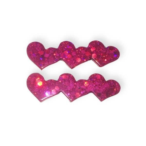 Σετ τσιμπιδάκια μαλλιών σε σχήμα καρδούλες, με φούξια ολογραφικό γκλίτερ.
