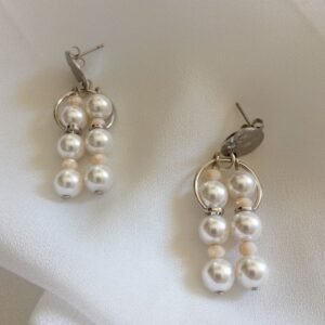 Σκουλαρίκια κρεμαστά, για τρυπημένα αυτιά, από ατσάλι, πέρλες από φίλντισι και κρύσταλλα. Τα κλιπ και οι κρίκοι είναι σε ασημί χρώμα. Μοναδικό ζευγάρι.