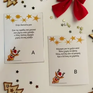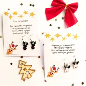Σκουλαρίκια χριστουγεννιάτικα με ταρανδάκια χρωματισμένα με υγρό γυαλί. Έχουν ατσάλινα καρφάκια (stainless steel 304) υποαλεργικά και είναι τοποθετημένα σε χριστουγεννιάτικο καρτελάκι με ευχή. Πρωτότυπο δωράκι για την δασκάλα η για τους αγαπημένους σας. Διαλέξτε το καρτελάκι που επιθυμείτε στην ένδειξη “Συσκευασία” .* Για την δασκάλα Α * Απλή ευχή Β Θα τα παραλάβετε σε συσκευασία δώρου