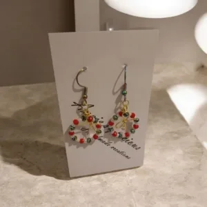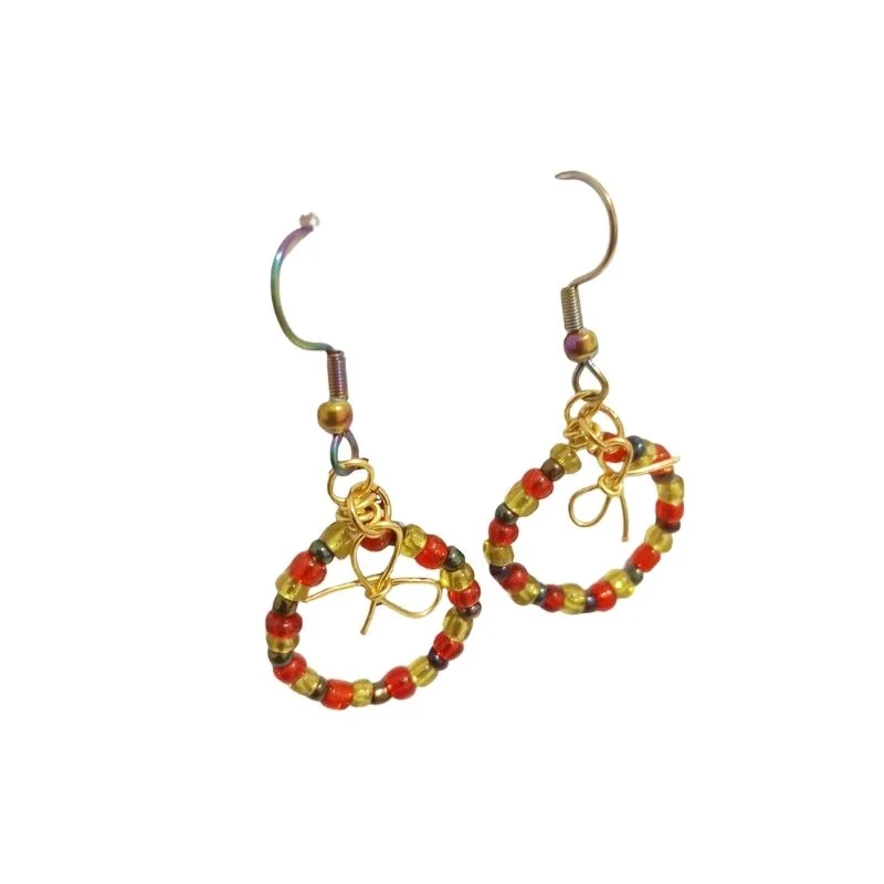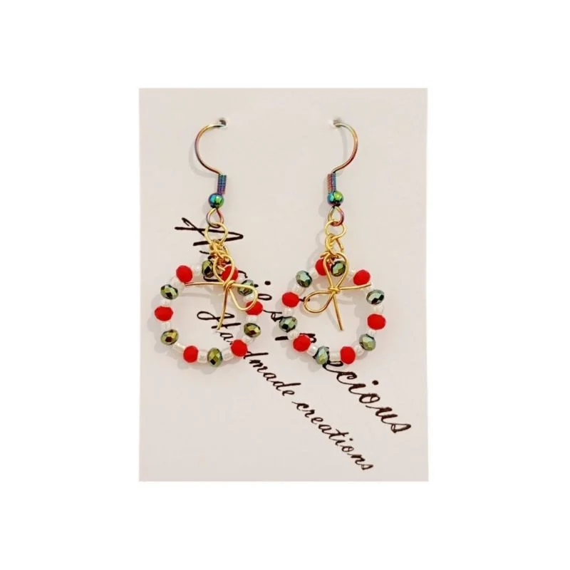 Χριστουγεννιάτικα σκουλαρίκια σε σχήμα στεφάνι με χάντρες και φιόγκο.