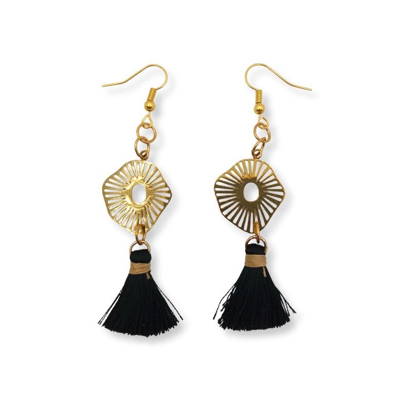 Τα ατσάλινα στοιχεία σε χρυσή απόχρωση διαθέτουν ανάγλυφη ακτινωτή υφή που αιχμαλωτίζει το φως, ενώ οι μαύρες φούντες προσθέτουν κίνηση και έντονο αισθητικό αποτέλεσμα.