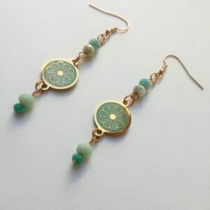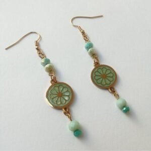 Κρεμαστά μακριά σκουλαρίκια με λουλουδάτο μοτίφ σε χρυσό & μέντα. Στολισμένα με κρυστάλλους σε αποχρώσεις μέντας και γαλάζιου, που αντανακλούν το φως και χαρίζουν διακριτική λάμψη.