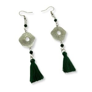 Σκουλαρίκια κρεμαστά, με ατσάλινο ακτινωτό στοιχείο σε ασημί χρώμα, κρύσταλλα σε πράσινο σκούρο και διακοσμητική φούντα σε πράσινο σκούρο.