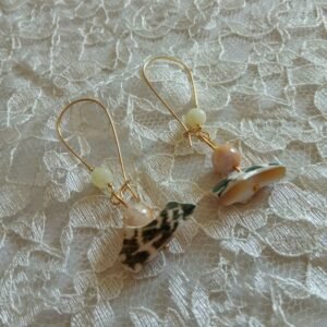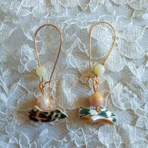 Κρεμαστά σκουλαρίκια από όστρακο, πέτρες αχάτη και γυαλί. Το όστρακο είναι σε αποχρώσεις του πράσινου και εκρού μπεζ ιριζέ. Οι πέτρες αχάτη είναι σε χρώμα ιβουάρ και οι πέτρες από γυαλί σε αποχρώσεις σομόν. Οι γάντζοι είναι από ατσάλι σε χρυσαφί χρώμα.