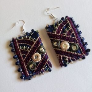 Σκουλαρίκια κρεμαστά φτιαγμένα από κεντημένη τρέσα σε σκούρο μπλε χρώμα, με λεπτομέρειες σε βυσσινί, λαδί και εκρού, διακοσμημένα με κρύσταλλα σε μπλε σκούρο και εκρού-χρυσαφί.