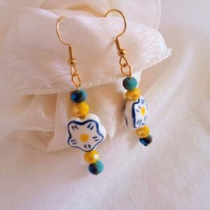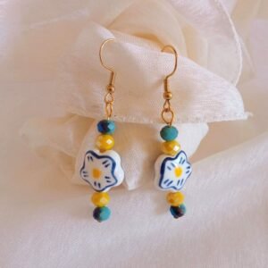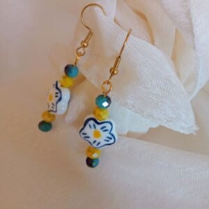 Δώστε χρώμα και στυλ στην εμφάνισή σας με αυτά τα μοναδικά σκουλαρίκια! Φτιαγμένα με αγάπη διαθέτουν κεραμικό στοιχείο σε σχήμα λουλουδιού και κρύσταλλα σε έντονο κίτρινο και μπλε-γαλάζιο.