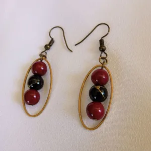 Σκουλαρίκια κρεμαστά, με ημιπολύτιμες πέτρες χαολίτη σε μπορντό χρώμα και πέτρες σε μαύρο με χρυσές λεπτομέρειες.