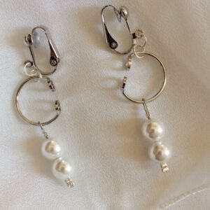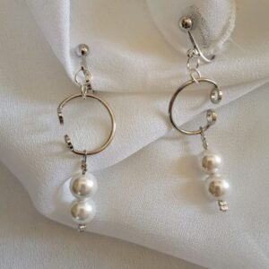 Σκουλαρίκια κρεμαστά, σε ασημί χρώμα, με ατσάλινο κρίκο και πέρλες από φίλντισι. Μπορούν να φορεθούν και από μη τρυπημένα αυτιά καθώς είναι με κλιπ.
