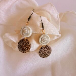 Σκουλαρίκια κρεμαστά, με κεραμική πέτρα λευκή και μεταλλικό στοιχείο σε χρυσαφί και μαύρο. Ελαφριά και ευκολοφόρετα.