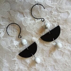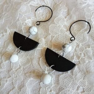Γυναικεία κρεμαστά σκουλαρίκια, με ατσάλινο κρίκο σε μαύρο χρώμα με στοπάκι, ξύλινα στοιχεία σε μαύρο χρώμα και ημιπολύτιμες πέτρες χαολίτη σε αποχρώσεις του γκρι-λευκού.