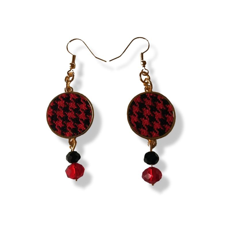 Κρεμαστά σκουλαρίκια, με γάντζο, κρύσταλλα σε κόκκινο σκούρο και μαύρο και μεταλλικό στοιχείο διαμέτρου 2εκ., με ύφασμα σε κόκκινο και μαύρο πιε ντε πουλ.