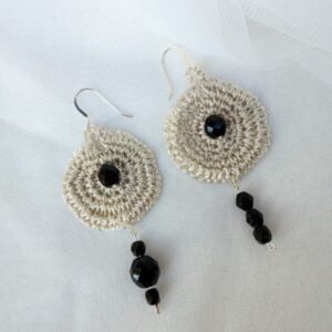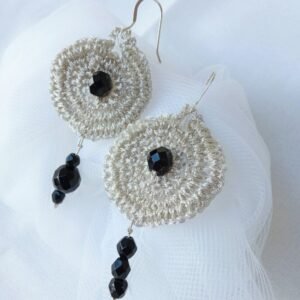 Μοναδικά σκουλαρίκια, σχεδιασμένα για να ξεχωρίζουν. Πλεγμένα με βελονάκι, από μεταλιζέ ασημί κλωστή, και διακοσμημένα με μαύρα κρύσταλλα που προσθέτουν βάθος και λάμψη σε κάθε εμφάνιση.