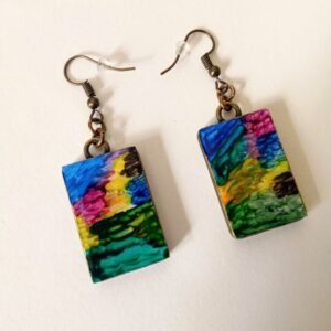 Σκουλαρίκια κρεμαστά, με μπρονζέ πλαίσιο και γάντζο και επικάλυψη υγρού γυαλιού και στις δύο πλευρές τους. Η μπροστινή πλευρά τους με απεικόνιση μέρους πίνακα του Matisse και η πίσω πλευρά τους ζωγραφισμένη στο χέρι.