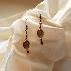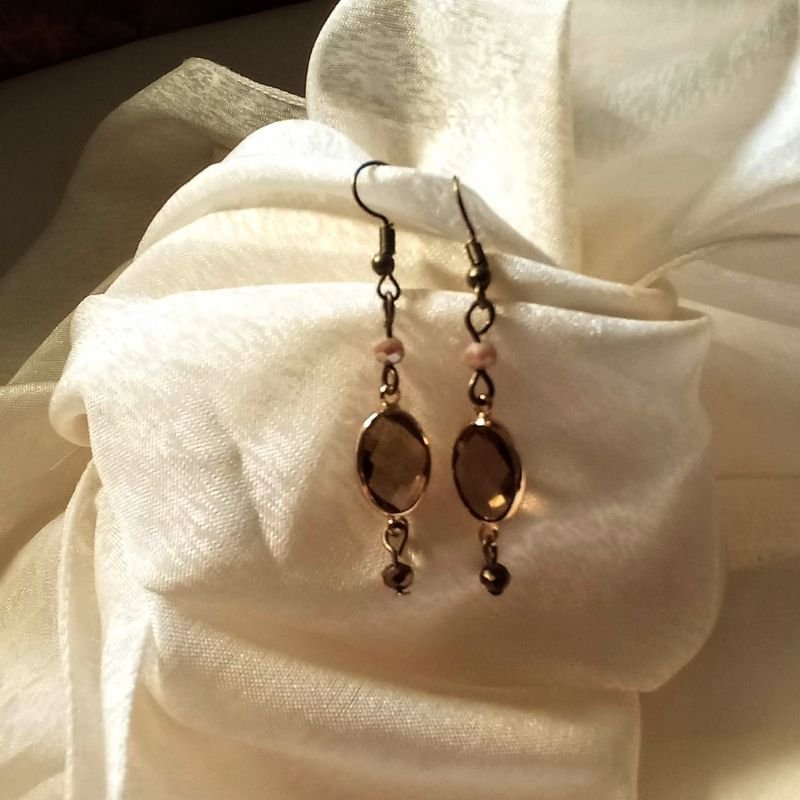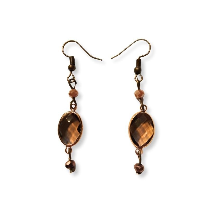 Kρεμαστά σκουλαρίκια, με κρύσταλλα σε αποχρώσεις καφέ-μπεζ και γαντζάκια στο χρώμα του μπρούντζου.