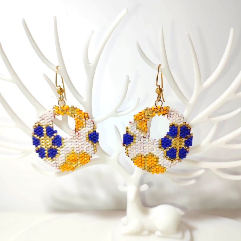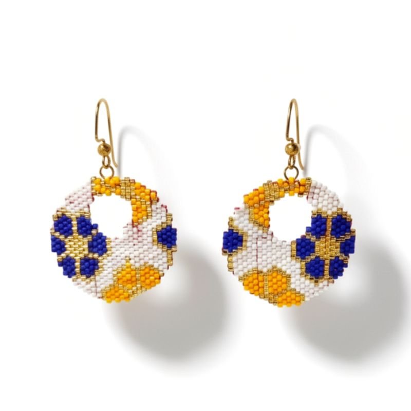 Σκουλαρίκια κρίκοι, με γυάλινες Ιαπωνικές χάντρες miyuki με ζωηρό floral μοτίβο σε royal blue και πορτοκαλί.