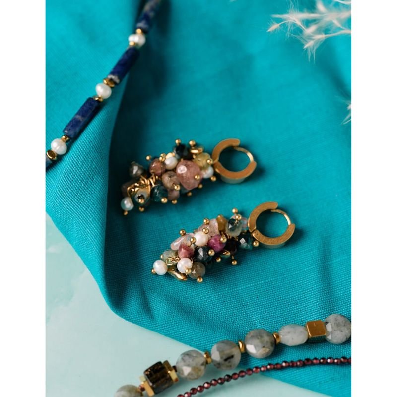 Χειροποίητα σκουλαρίκια κρίκοι από ανοξείδωτο ατσάλι σε χρυσή απόχρωση, διακοσμημένα με φυσικές ημιπολύτιμες πέτρες σε πολύχρωμους τόνους και μικρά μαργαριτάρια. Ένα εντυπωσιακό αλλά κομψό κόσμημα που χαρίζει χρώμα και φως σε κάθε εμφάνιση, από το πρωί μέχρι το βράδυ.