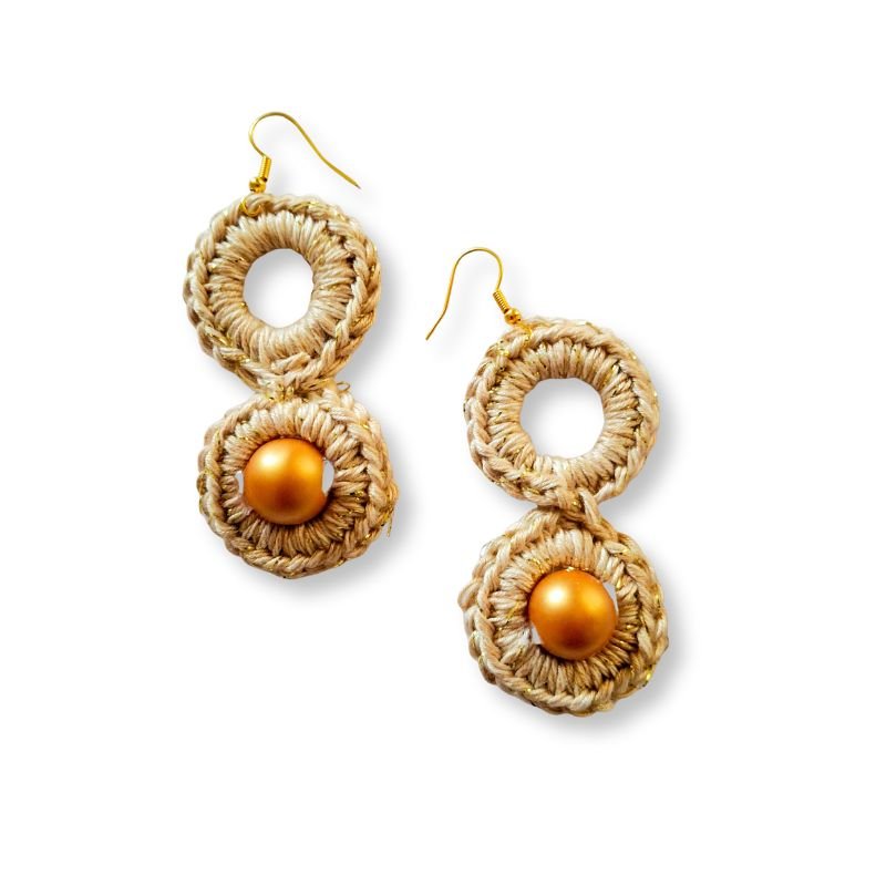 Πλεκτά γυναικεία κρεμαστά σκουλαρίκια σε σχέδιο κρίκου, με λεπτομέρειες σε χρυσό χρώμα.