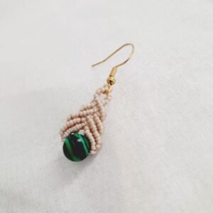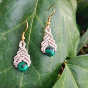 Χειροποίητα σκουλαρίκια σε nude χρώμα με την τεχνική του μακραμέ με ημιπολύτιμη πέτρα μαλαχίτης.