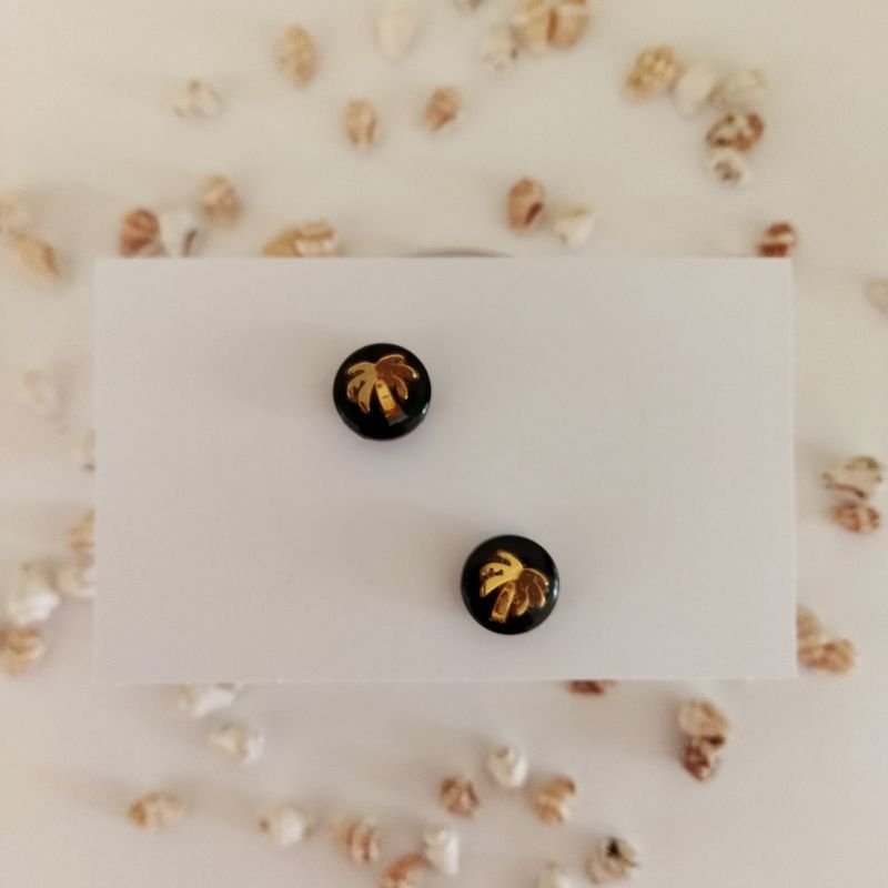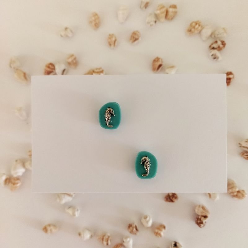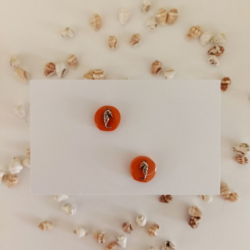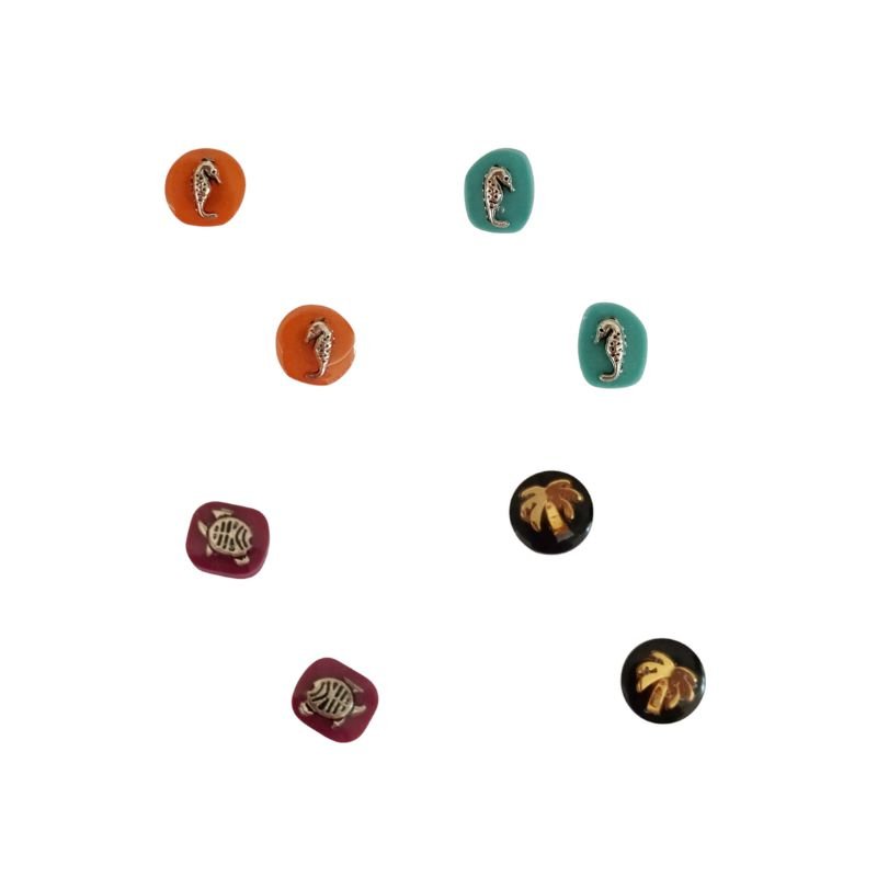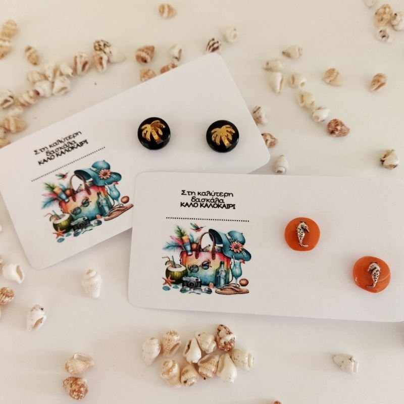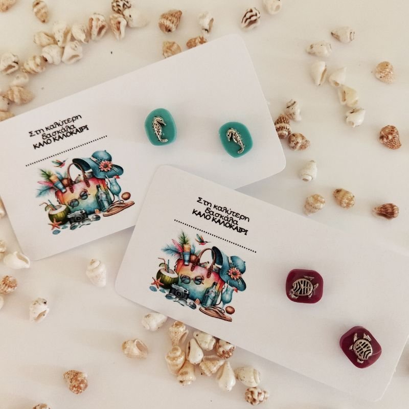Καρφωτά σκουλαρίκια με καλοκαιρινά μεταλλικά στοιχεία , ιππόκαμπους, ψαράκια και φοίνικες σε υγρό γυαλί.