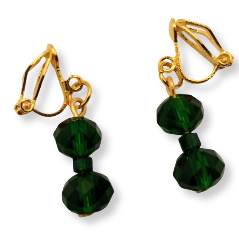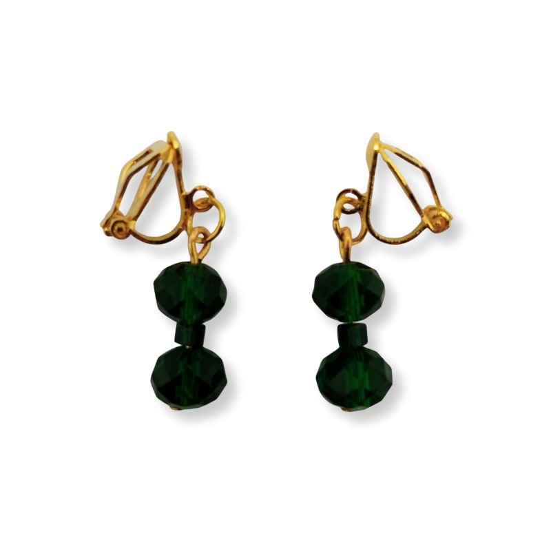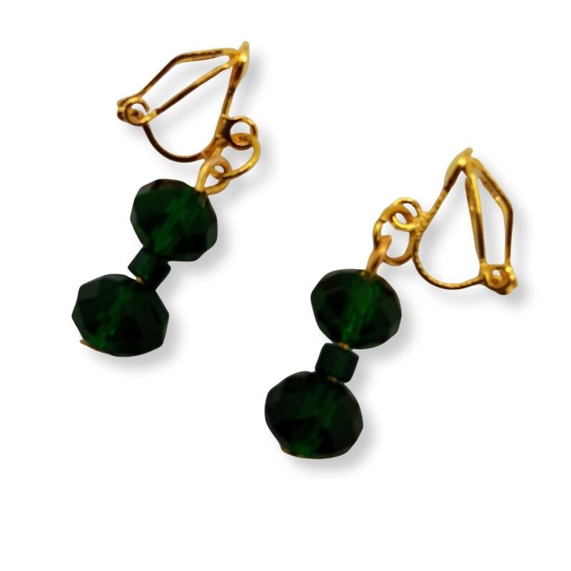 Σκουλαρίκια με λαμπερά σκούρα πράσινα κρύσταλλα και χρυσαφί μεταλλική βάση με κλιπ, που προσφέρουν άνετη εφαρμογή χωρίς να απαιτείται τρύπα στο αυτί.