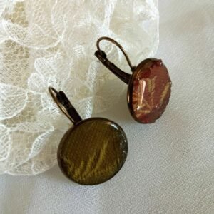 Σκουλαρίκια vintage μπρονζέ, κρεμαστά με γάντζο. Εσωτερικά έχουν ζακάρ ύφασμα σε λαδί και καφέ αποχρώσεις και είναι επικαλυμμένα με υγρό γυαλί, σε μπρονζέ αντικέ στρογγυλό πλαίσιο.