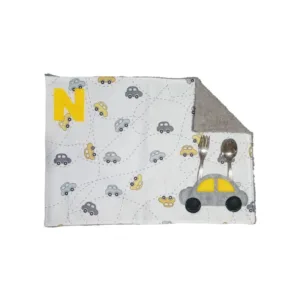 Η μια πλευρά είναι από βαμβακερό ύφασμα σε λευκό χρώμα με αυτικινητάκια και από την άλλη βαμβακερή πετσέτα σε γκρι χρώμα.