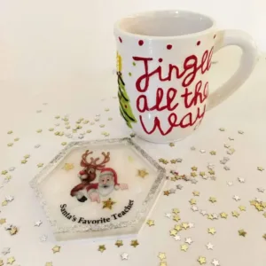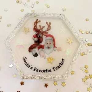 Σουβέρ χριστουγεννιάτικα για τη δασκάλα από υγρό γυαλί. Εξ ολοκλήρου χειροποίητα σε δύο μοναδικά σχέδια. Το πρώτο είναι σε πολυγωνικό σχήμα διαστάσεων 9,5 Χ 11 εκατοστά με “χείλος”. Μπορεί να χρησιμοποιηθεί και για τα κλειδιά η σαν βάση για κοσμήματα. Το δεύτερο είναι στρογγυλό διαμέτρου 9,5 εκατοστών 3D με τον μπισκοτούλη και το μπαστουνάκι γλιφιτζούρι επίσης απο υγρό γυαλί. Η πίσω όψη του σουβέρ έχει αντιολισθιτικό φελό. Πρωτότυπα και μοναδικά δωράκια που σίγουρα θα εντυπωσιάσουν τη δασκάλα. Θα τα παραλάβετε σε συσκευασία δώρου