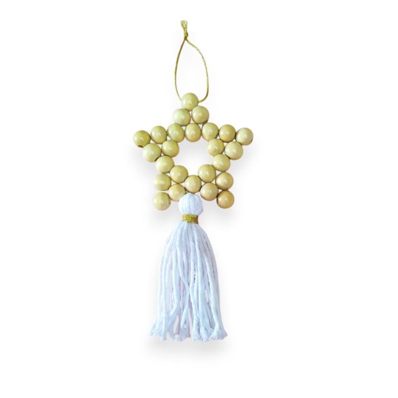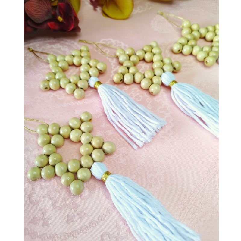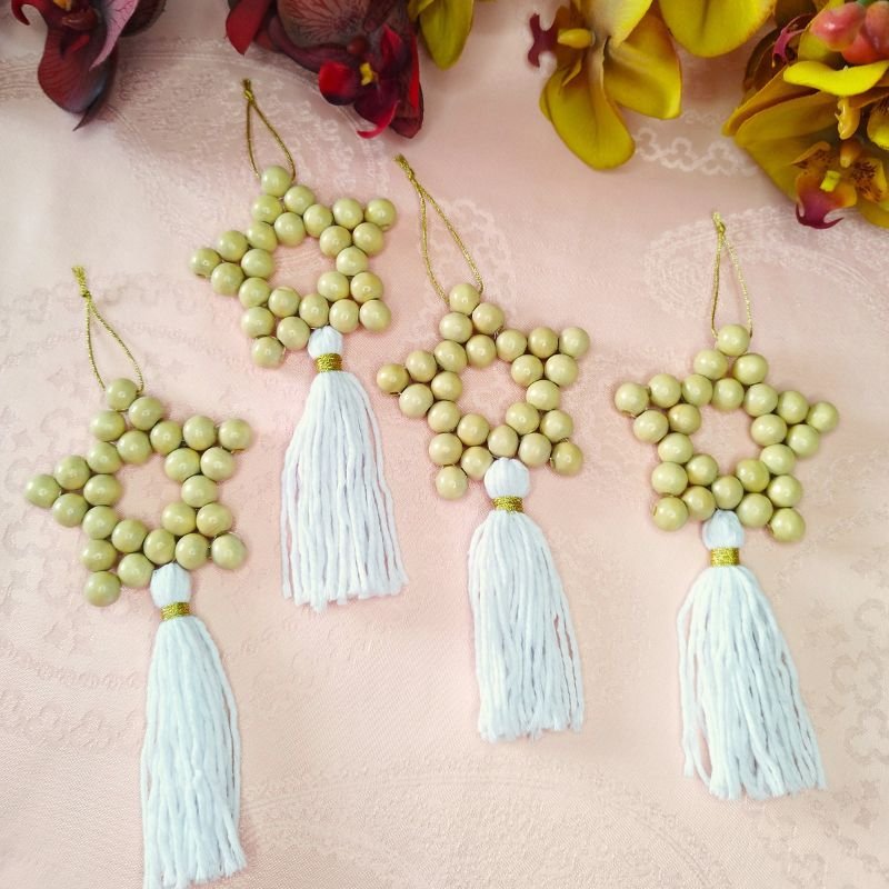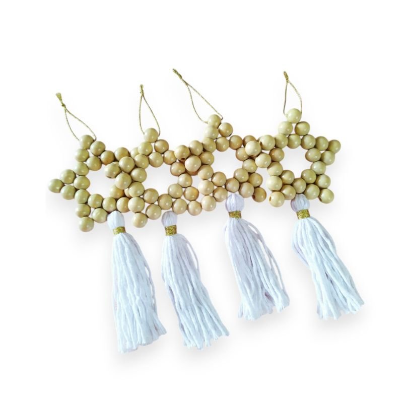 Κατασκευασμένα από ξύλινες χάντρες και διακοσμημένα με απαλά λευκά κρόσσια, θα δώσουν μια μίνιμαλ, μποέμ αισθητική στο χριστουγεννιάτικο δέντρο σου ή το χώρο σου.