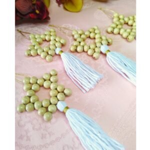 - Υλικό: ξύλινες χάντρες, λευκά κρόσσια
