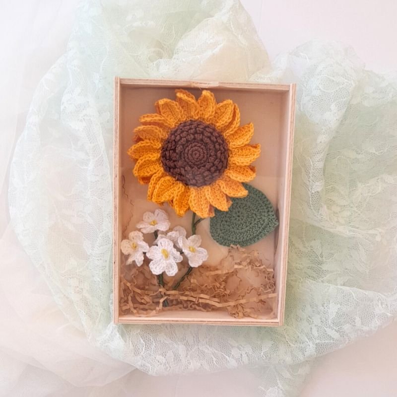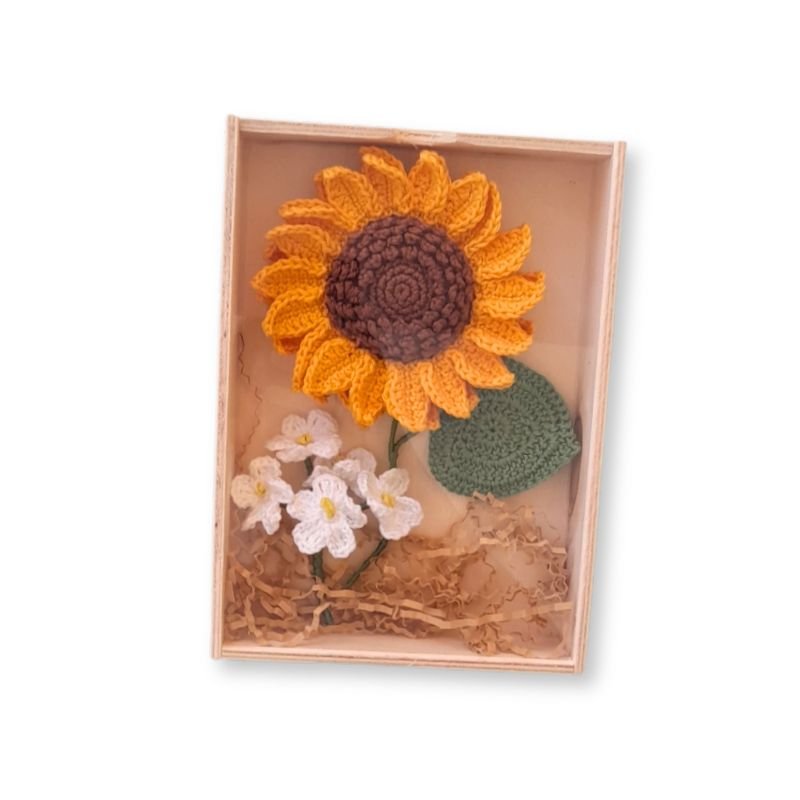 Σύνθεση από πλεκτό ηλιοτρόπιο και λευκά άνθη Μη-με λησμόνει μέσα σε ξύλινο κουτί διαστάσεων 22x15cm με πλεξιγκλάς μπροστά