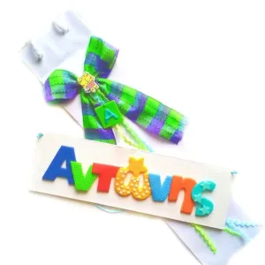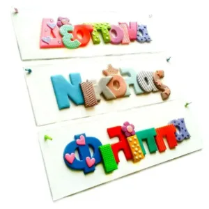 Χειροποίητες μικρές πινακιδούλες για να στολίσουν το παιδικό δωμάτιο. Για την πόρτα ή τον τοίχο με το όνομα του λατρεμένου σας πιτσιρικιού, σε χρώματα που θα ταιριάζουν στον χώρο και στις επιθυμίες σας. Έχουν ξύλινη βάση, με διαστάσεις 8Χ26Χ0,4 εκατοστά και το όνομα είναι χειροποίητο από πολυμερικό πηλό στα χρώματα που σας ταιριάζουν. Έχει την δυνατότητα είτε να κρεμαστεί στον τοίχο με το κορδόνι, είτε να κολληθεί στην πόρτα με ταινία διπλής όψης η οποία υπάρχει στην πίσω πλευρά (περιλαμβάνονται και τα δύο). Στην περίπτωση που αφαιρέσετε το κορδόνι, υπάρχουν δυο επιπλέον στοιχεία (αστεράκια ή λουλούδια) για να τα χρησιμοποιήσετε και να καλύψετε τις τρύπες.