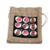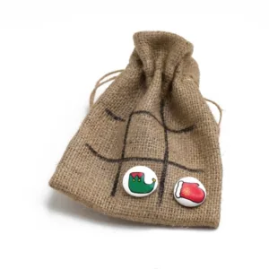 Το κάθε σετ παιχνιδιού περιλαμβάνει: 9 χειροποίητα πήλινα πιόνια και ένα πουγκάκι με ζωγραφισμένη την επιφάνεια του παιχνιδιού.