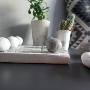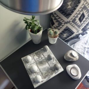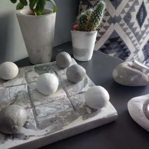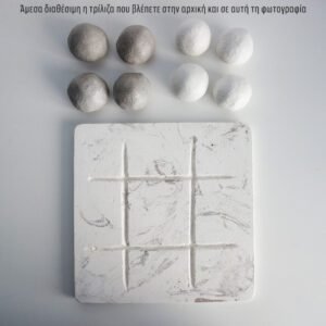 Τρίλιζα από λευκό και γκρι τσιμέντο περασμένο με ακρυλικό οικολογικό βερνίκι. Δίνει την αίσθηση μάρμαρου. Αποτελείται από μία τετράγωνη βάση 17,5cm X 17,5cm X 2cm και 8 σφαιρικά πιόνια τα οποία από την κάτω πλευρά είναι ελαφρώς επίπεδα για να μη κυλούν. Ένα ιδιαίτερο δώρο για ιδιαίτερες περιστάσεις. Ένα κλασσικό επιτραπέζιο παιχνίδι που μπορεί όχι μόνο να ψυχαγωγήσει αλλά και να διακοσμήσει έναν χώρο. Για διευκρινήσεις σχετικά με παραγγελίες και παραλλαγές σε χρώμα ή μέγεθος της αρεσκείας σας , παρακαλώ επικοινωνήστε με τη δημιουργό.