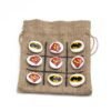 Το κάθε σετ παιχνιδιού περιλαμβάνει: 9 χειροποίητα πήλινα πιόνια και ένα πουγκάκι με ζωγραφισμένη την επιφάνεια του παιχνιδιού. Το πουγκάκι έχει διαστάσεις 14*18εκ.