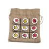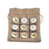 Το κάθε σετ παιχνιδιού περιλαμβάνει: 9 χειροποίητα πήλινα πιόνια και ένα πουγκάκι με ζωγραφισμένη την επιφάνεια του παιχνιδιού. Το πουγκάκι έχει διαστάσεις 14*18εκ.