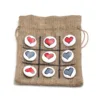 Το κάθε σετ παιχνιδιού περιλαμβάνει: 9 χειροποίητα πήλινα πιόνια και ένα πουγκάκι με ζωγραφισμένη την επιφάνεια του παιχνιδιού. Το πουγκάκι έχει διαστάσεις 14*18εκ.