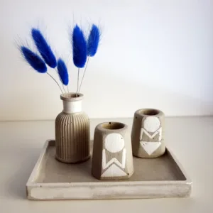Σετ για το μπάνιο που αποτελείται από δύο βάσεις για οδοντόβουρτσες σε σχήμα κώνου ζωγραφισμένες στο χέρι, ένα δισκάκι και ένα διακοσμητικό μικρό βαζάκι με ένα μπουκετάκι αποξηραμένα μπλε λουλουδάκια από γκρι τσιμέντο με χρωματιστές λευκές λεπτομέρειες, περασμένα με ακρυλικό οικολογικό βερνίκι. Μια ξεχωριστή ιδέα για το μπάνιο σας με πολλαπλή χρήση και natural αισθητική.