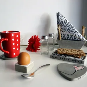 Σετ για το αβγό φτιαγμένο από τσιμέντο, και περασμένο με ακρυλικό οικολογικό βερνίκι. Περιλαμβάνει ένα παραλληλόγραμμο δισκάκι, μία θήκη για το αβγό και δύο θήκες με διάτρητο μεταλλικό καπάκι, μία για αλάτι και μία για πιπέρι, και ένα κουταλάκι. Είναι ζωγραφισμένο στο χέρι. Μια ξεχωριστή πρόταση για το τραπέζι σας, για industrial style.