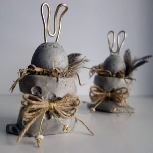 Σετ που αποτελείται από δύο τσιμεντένια αυγά/κουνελάκια με αυτιά από σύρμα αλουμινίου σε χρυσό ματ χρώμα, και δύο μικρά πουγκιά που παίζουν το ρόλο της φωλιάς. Είναι όλα περασμένα με ακρυλικό οικολογικό βερνίκι. Μια ξεχωριστή χειροποίητη πρόταση για Πασχαλινό δώρο.