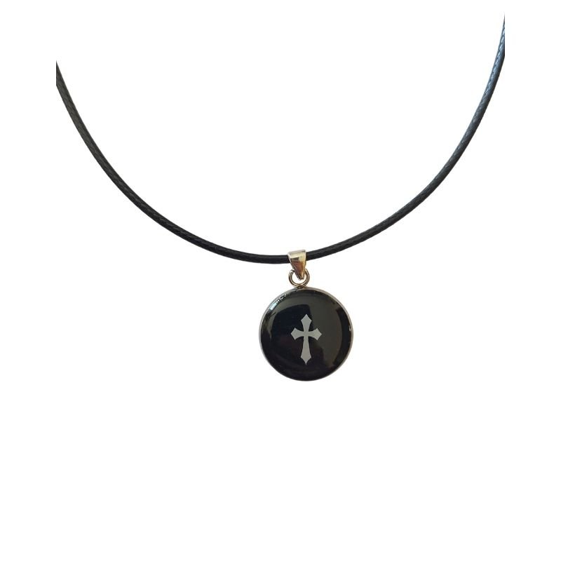 Το μενταγιόν είναι από μεταλλική ασημένια βάση με μαύρο γέμισμα – φόντο και στο κέντρο ο σταυρός ασημένιος με περίτεχνες άκρες. Συνδυάζεται με μαύρο λουράκι που αυξομειώνει.